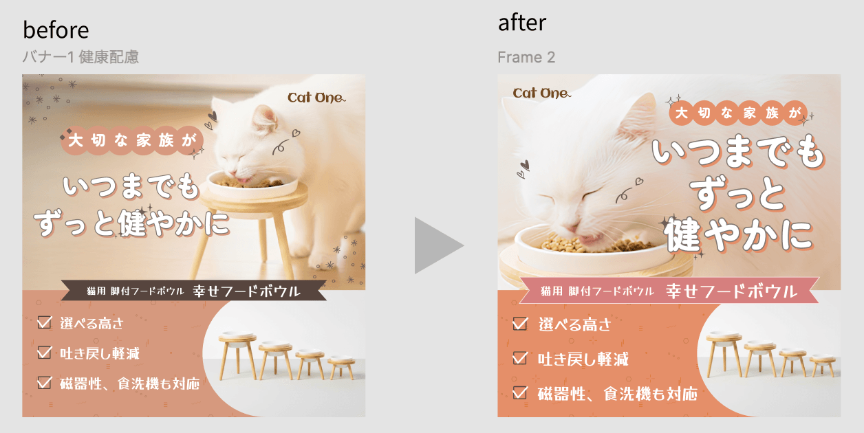 ・猫と猫の写真の間の白枠が気になってしまう。スカスカに見えるので、色をつけてもいいかも。